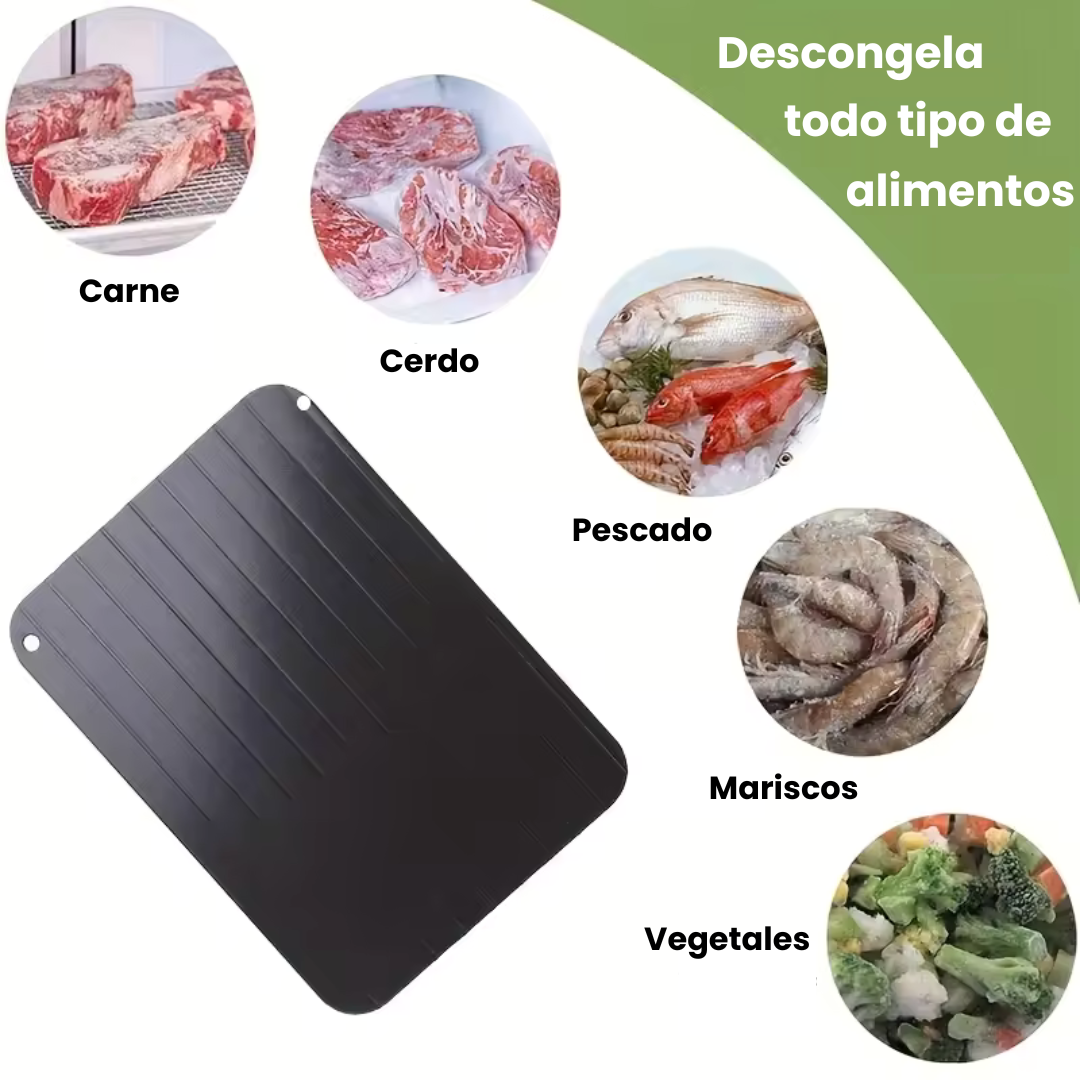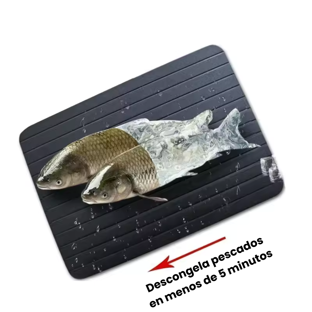 Ahorra tiempo en tu cocina. Esta bandeja descongela carnes, pescados y vegetales de manera natural, sin electricidad, microondas ni químicos.